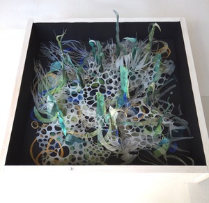 2020assemblage van knipsels gekleurd papier, tekeningen met fineliner, in houten bak, metaaldraad, foamplaat