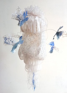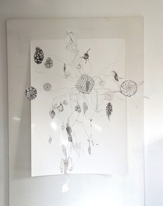 2021mobile met tekeningen van fineliner op calqueerpapier, ijzerdraad, en potloodtekening als echo erachter